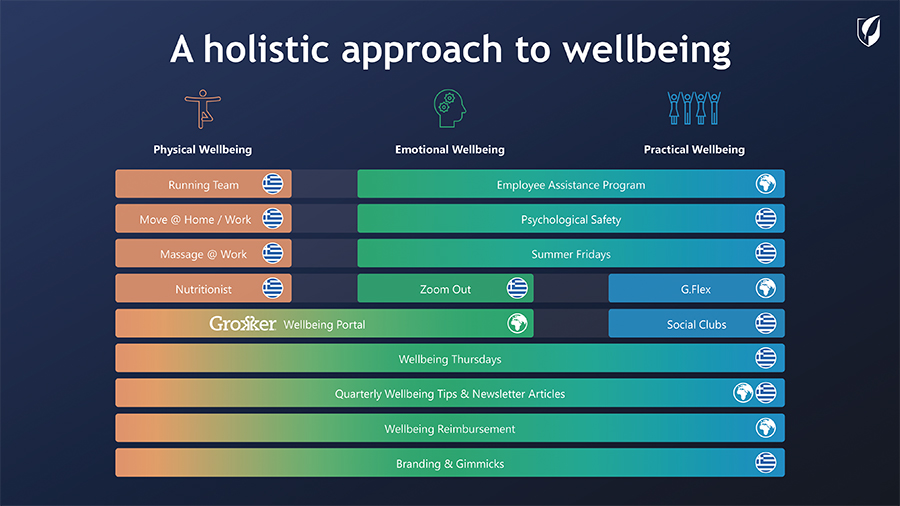 - Πρακτική ευεξία: ισορροπία επαγγελματικής και προσωπικής ζωής και ωφέλιμες και υγιείς σχέσεις στο χώρο εργασίας. Ευελιξία στον τόπο και το χρόνο εργασίας μέσω του G.Flex, ομάδες κοινών ενδιαφερόντων, αλλά και την πολύ σημαντική δουλειά που κάναμε πρόσφατα αναφορικά με το psychological safety που βοηθά και καλλιεργεί σχέσης βαθύτερης εμπιστοσύνης.