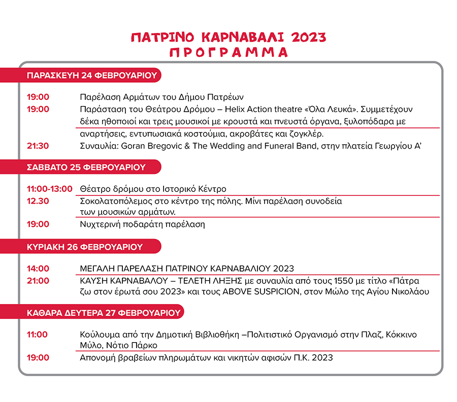 Το Πατρινό καρναβάλι αποτελεί τόσο τη μεγαλύτερη όσο και την παλιότερη αποκριάτικη εκδήλωση στην Ελλάδα και μία από τις μεγαλύτερες στο κόσμο όσον αφορά τη συμμετοχή των καρναβαλιστών και την ιστορία του. Μετρά 193 χρόνια ιστορίας. Το καρναβάλι της Πάτρας δεν είναι ένα μεμονωμένο γεγονός αλλά ένα σύνολο εκδηλώσεων που περιλαμβάνουν χορούς, παρελάσεις, κυνήγι κρυμμένου θησαυρού, καρναβάλι των μικρών κ.ά. Οι εκδηλώσεις αρχίζουν στις 17 Ιανουαρίου και διαρκούν μέχρι την Καθαρά Δευτέρα. Κορυφώνεται το τελευταίο Σαββατοκύριακο της Αποκριάς με την νυχτερινή ποδαράτη παρέλαση των πληρωμάτων του Σαββάτου, τη φαντασμαγορική μεγάλη παρέλαση αρμάτων και πληρωμάτων της Κυριακής και τέλος το τελετουργικό κάψιμο του βασιλιά καρνάβαλου στο μώλο της Αγίου Νικολάου στο βόρειο λιμάνι της Πάτρας. Χαρακτηριστικές αρχές του είναι ο αυθορμητισμός, ο αυτοσχεδιασμός, η πηγαία έμπνευση και ο εθελοντισμός.